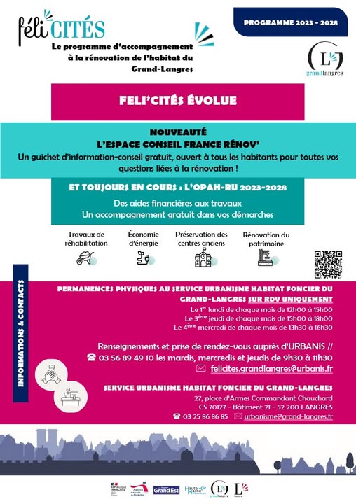 Contacts : 03 56 89 49 10 (du mardi au jeudi, 9h30–11h30) – felicites.grandlangres@urbanis.fr